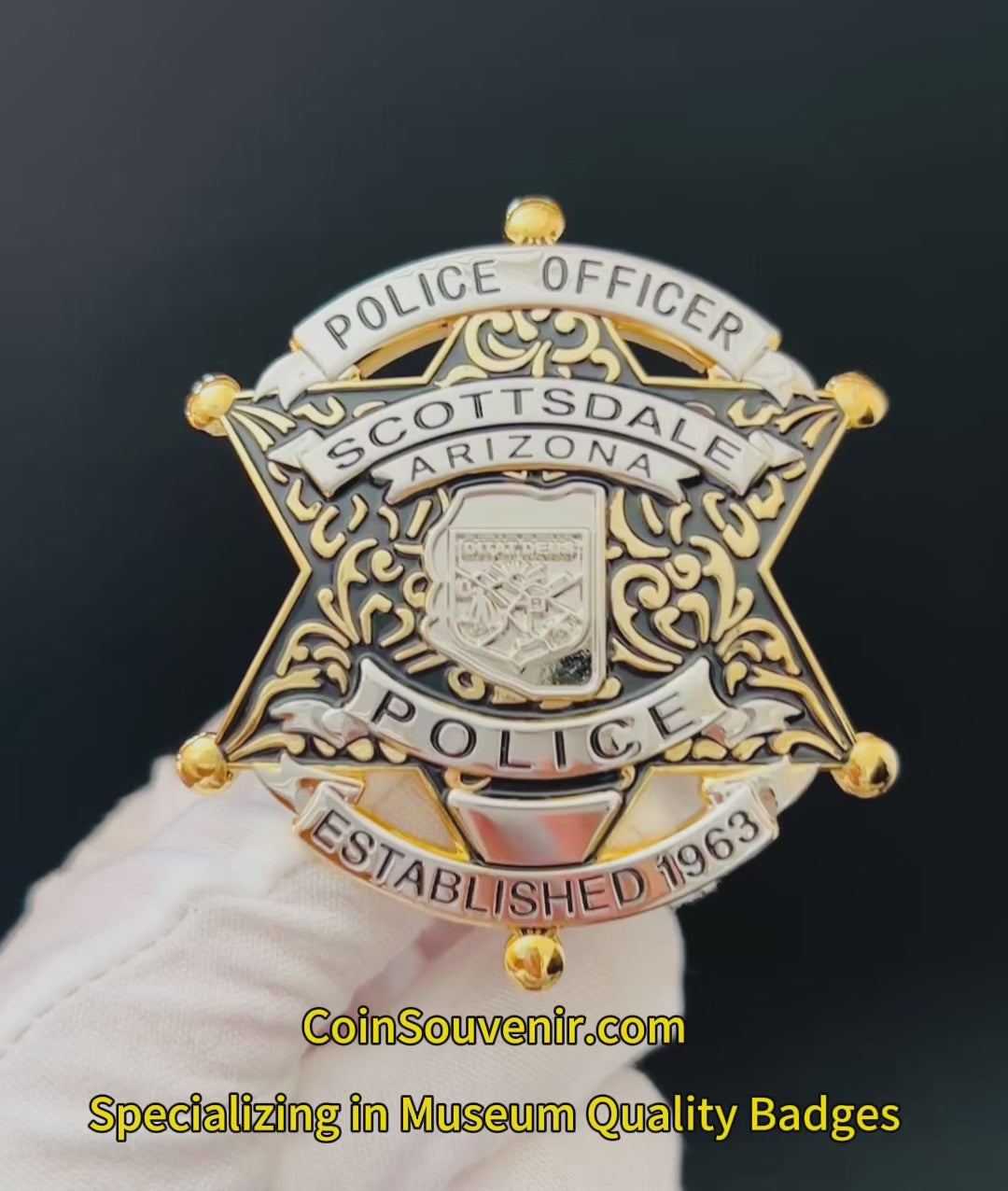 This SPD Arizona Scottsdale Police Officer Badge offers unmatched quality, detail, and realism. It's made of solid copper inside with a safety pin on the back. Proudly Made in the USA, the highest police quality, the finest details and materials, exquisite workmanship, sturdy and durable! Add it to your collection or make a great gift! It's also the top choice by prop masters worldwide. It's definitely the closest that you can find to the real thing!
